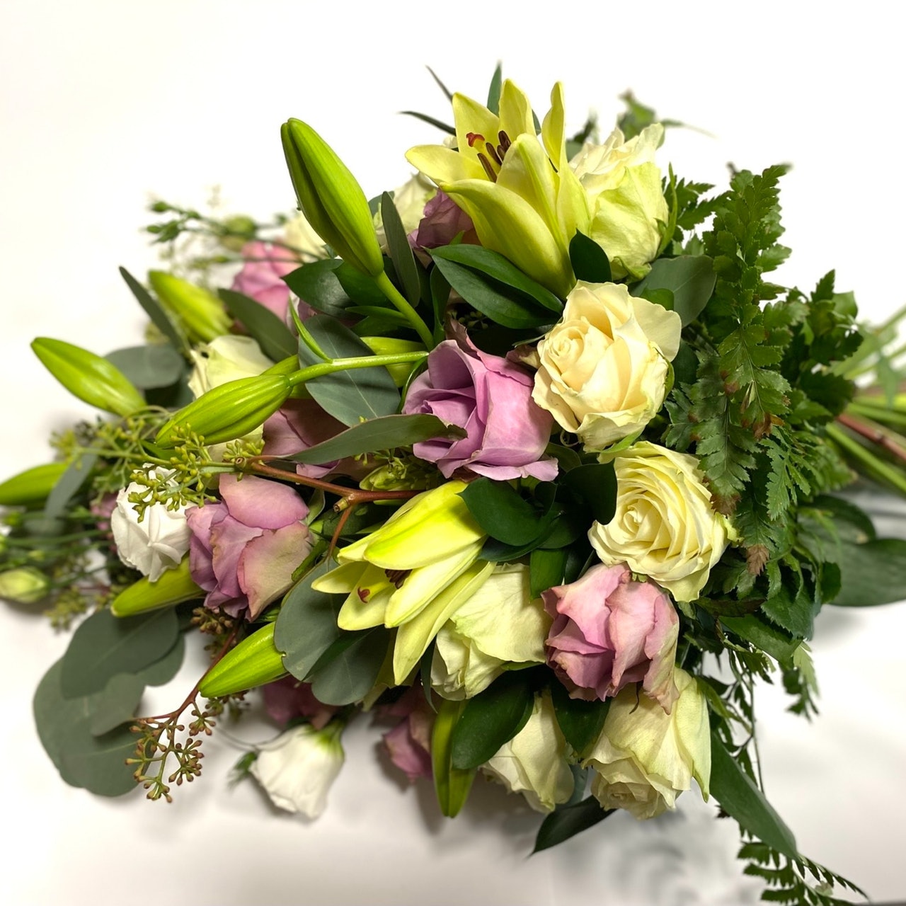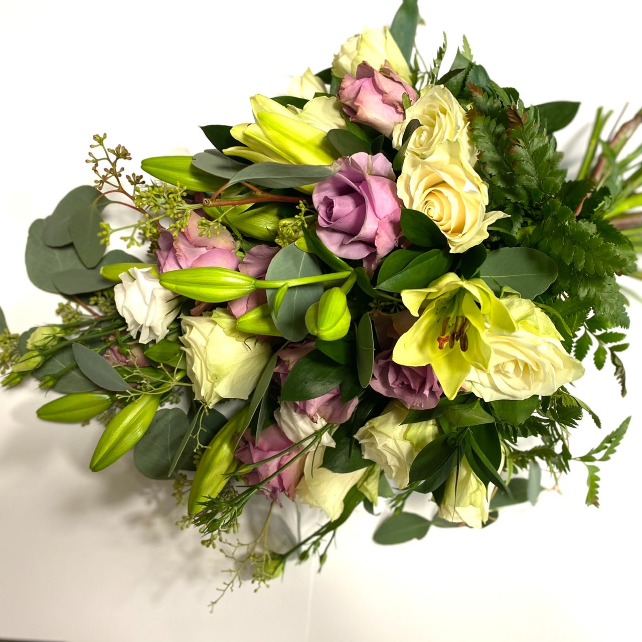 Bårebukett i lilla og hvite nyanser med innslag av grønt.