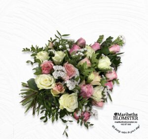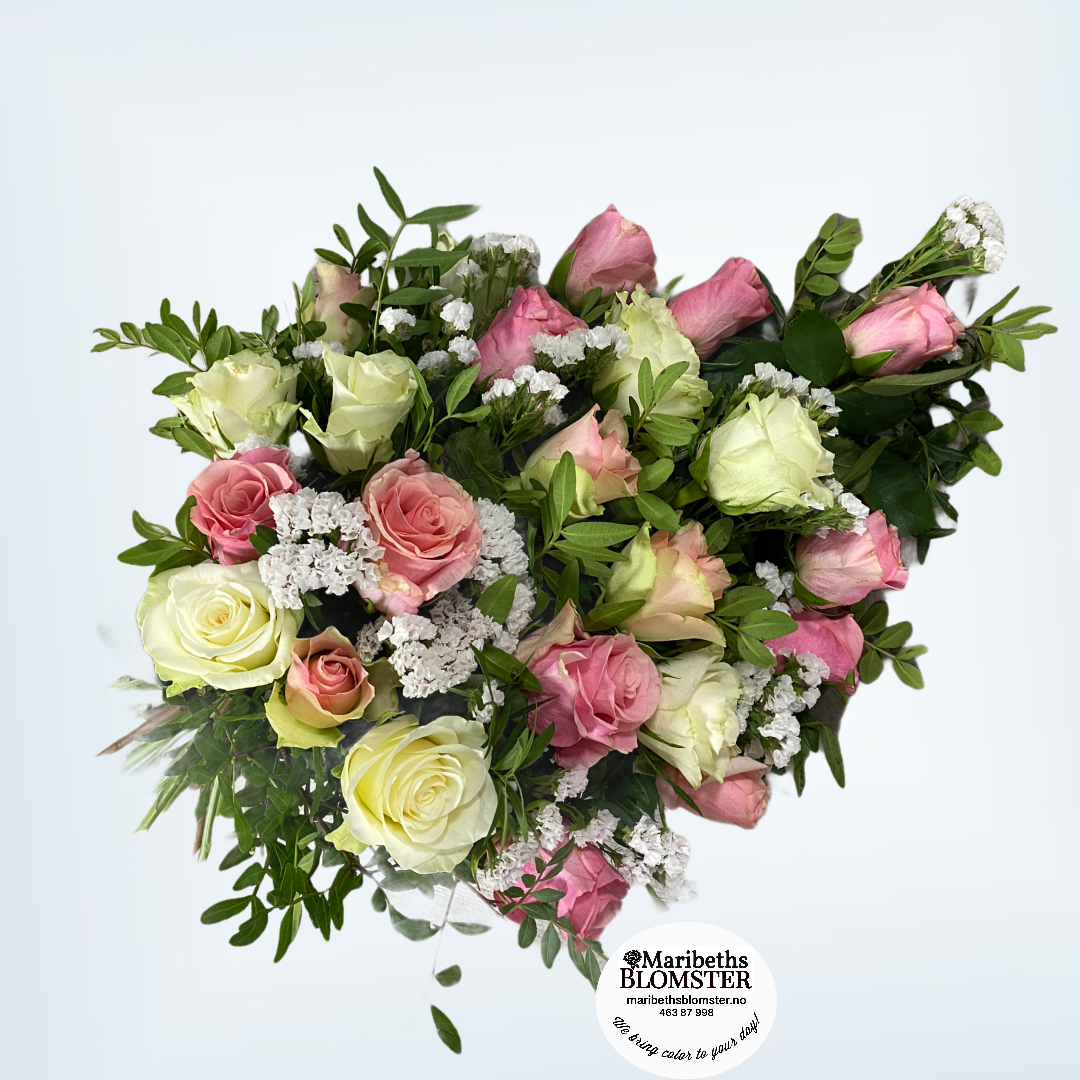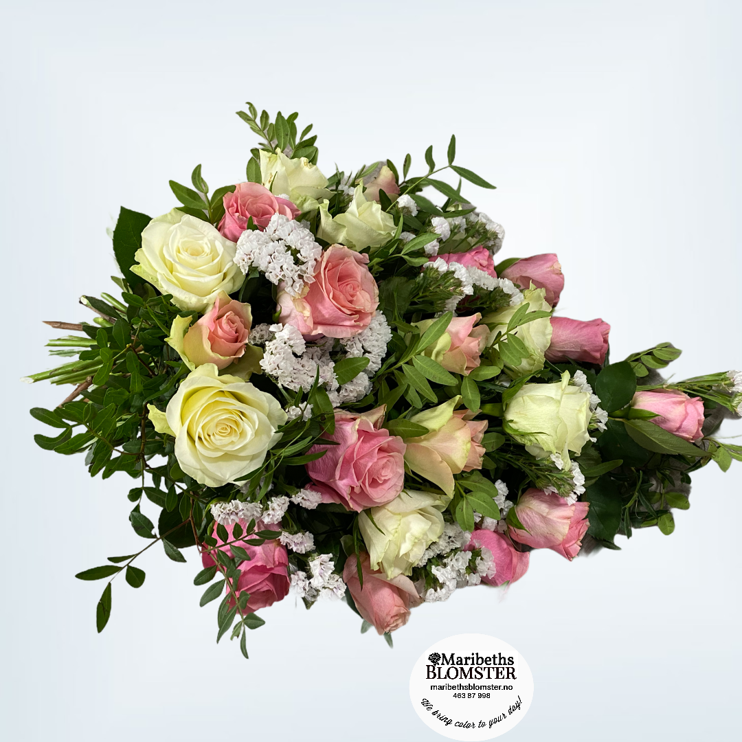 Bårebukett i hvit og rosa nyanser. En koselig bårebukett til å ta den siste farvel.