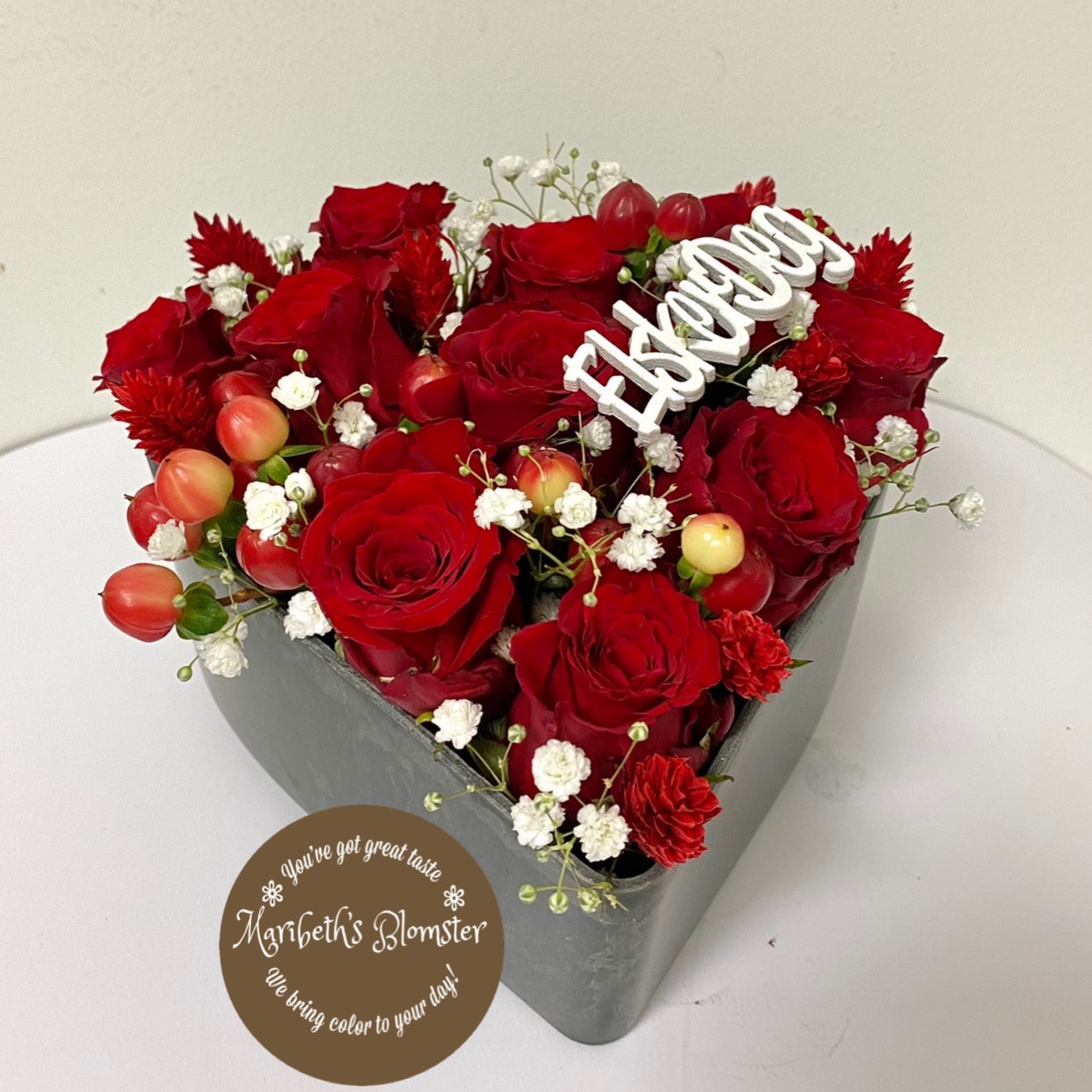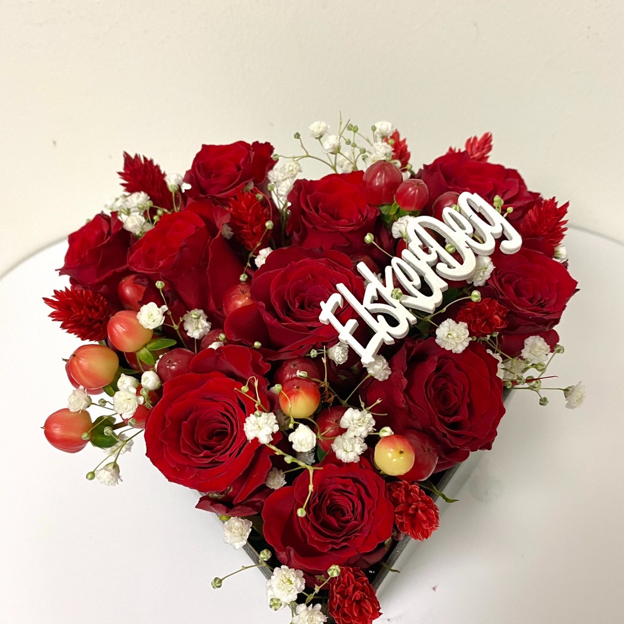 Flott romantisk hjerte dekorasjon i røde roser med brudeslør og hypericum. vil du glede eller overraske din kjære? Su kommer ikke å ta feil på dette dekorasjon. La blomstene snakke for deg!