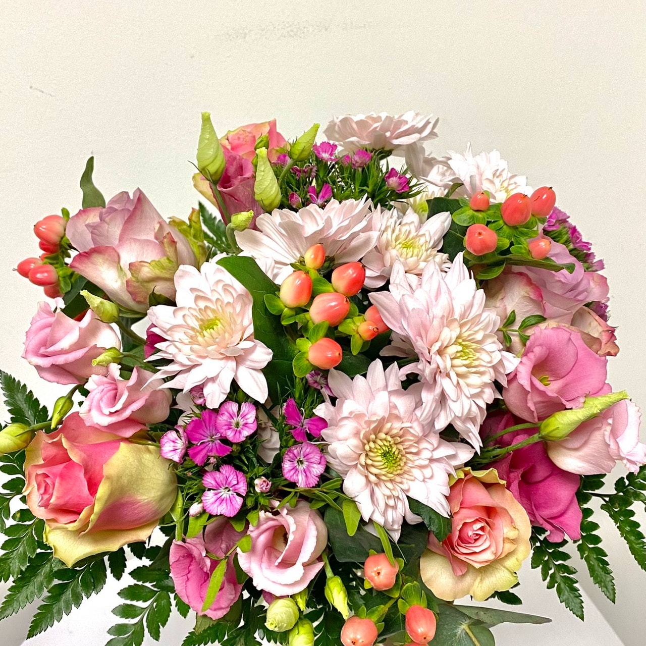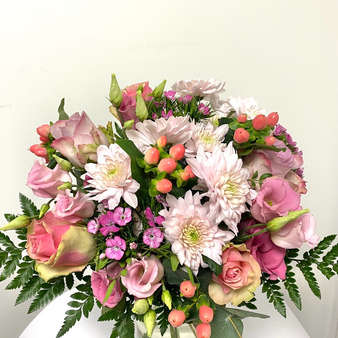 Nydelig blomsterbukett i rosa tone med innslag av eukalyptus og grønt. Denne oppsatsen vil gi varme og oppmuntre. Koselig gave som passer til enhver anledning